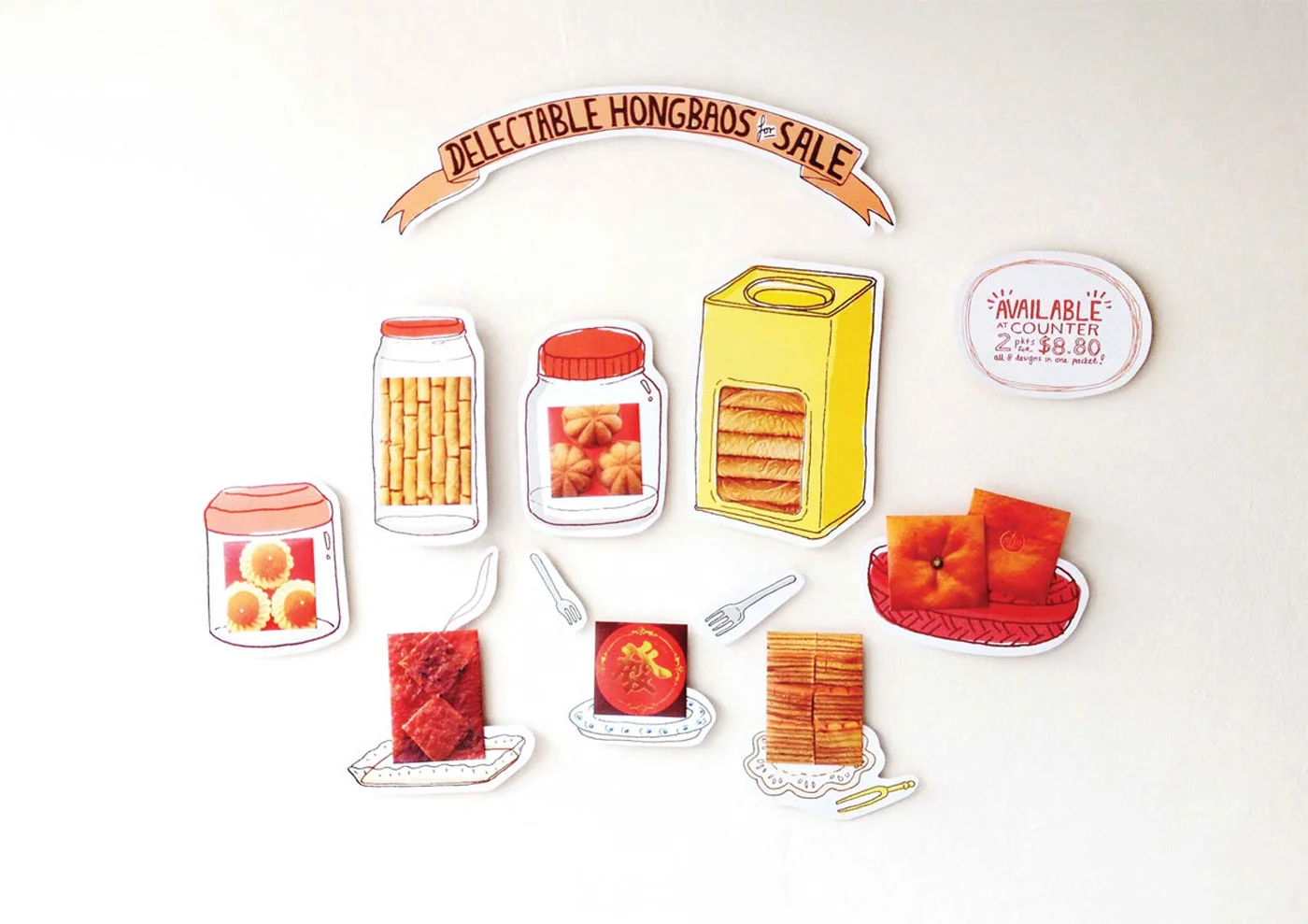 Two things we look most forward to during Chinese New Year: the festive food and the Hongbaos (紅包: Red packet in Chinese). A local take on these gleaming red packets, these local Chinese new year goodies like Pineapple Tarts, Bak Kwa and Hei Bi Hiam become textural appetizing prints. Incidentally in the past, snacks were packed into these Hongbaos instead of money.