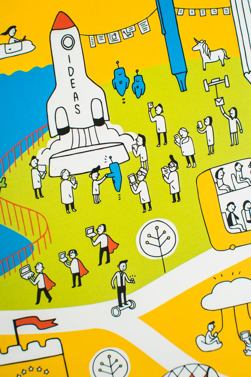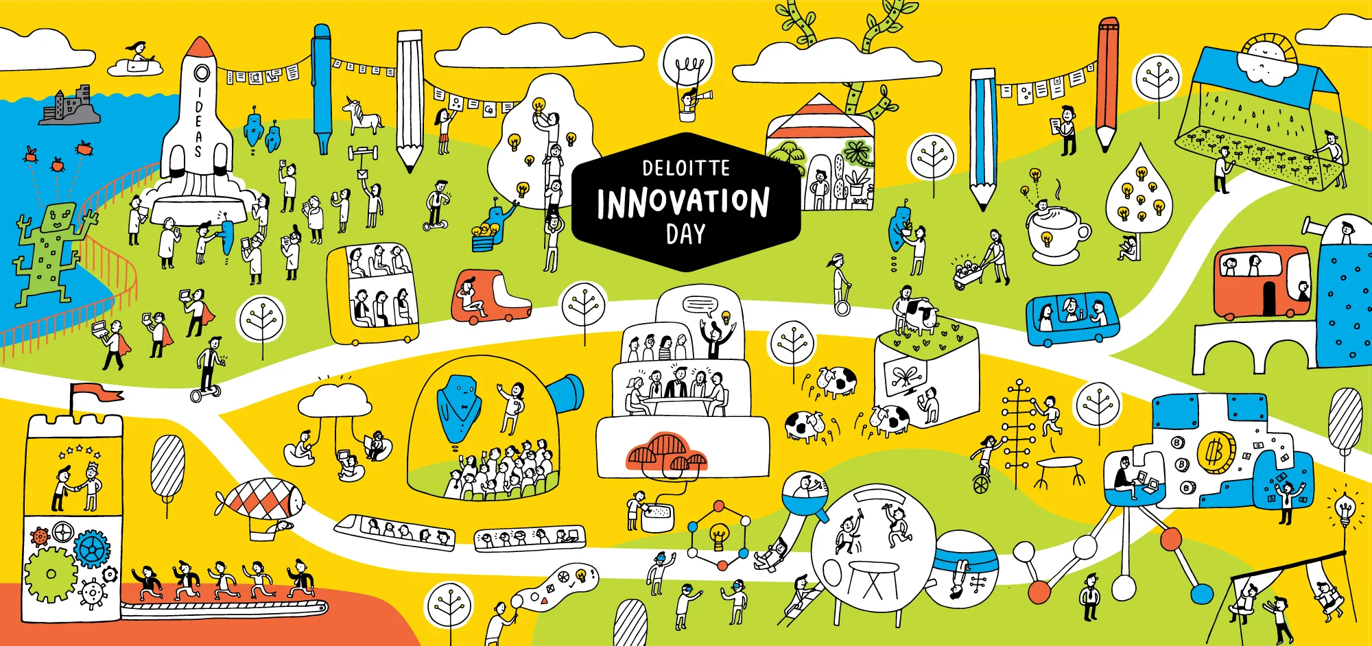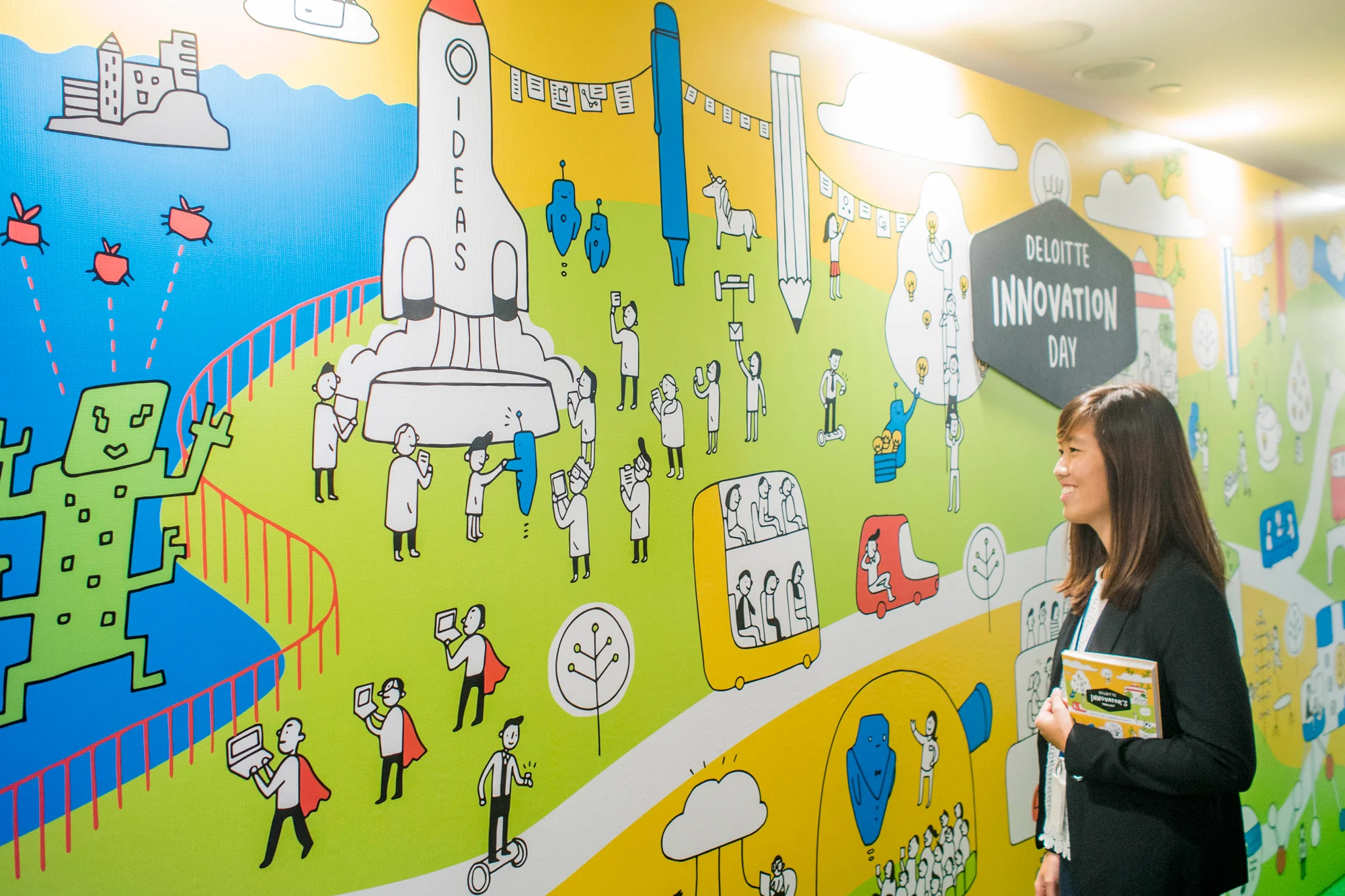 Deloitte celebrated its inaugural Innovation Day and what better way to showcase how design thinking and innovation is being nurtured and implemented in the company's various services than a giant mural! From being the launchpad of new ideas for their clients to being on top of the game with the latest and greatest, this mural envisions what each integral role each person plays in thinking and working creatively. Each Deloitte employee was also given a handbook to Innovative thinking featuring the same artwork, which included handlettered quote stickers and a a pull-out on Deloitte's DARE framework of design thinking and realising ideas from concept to reality.