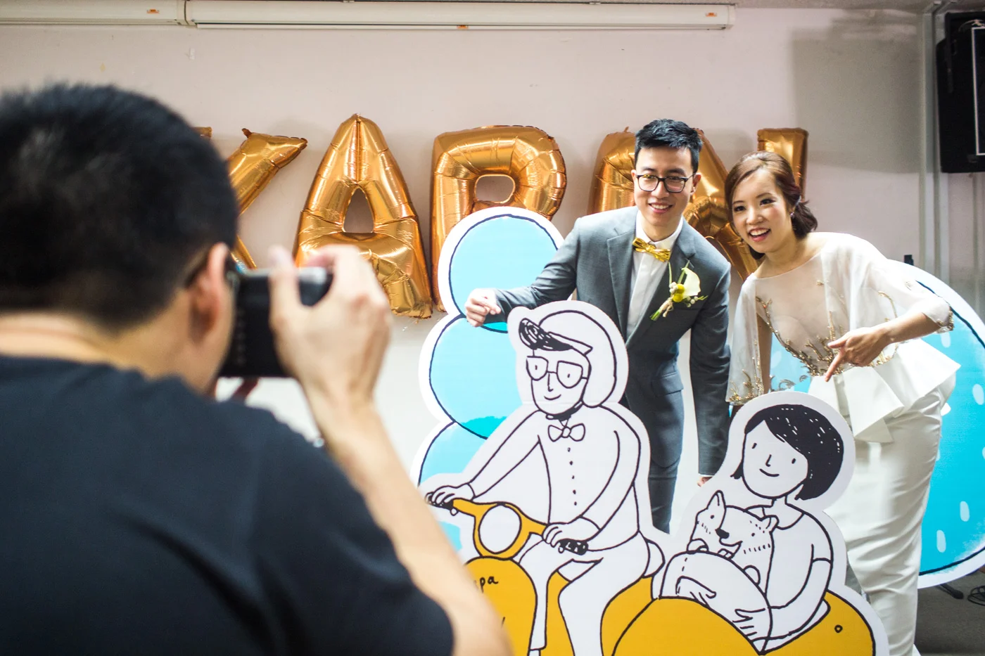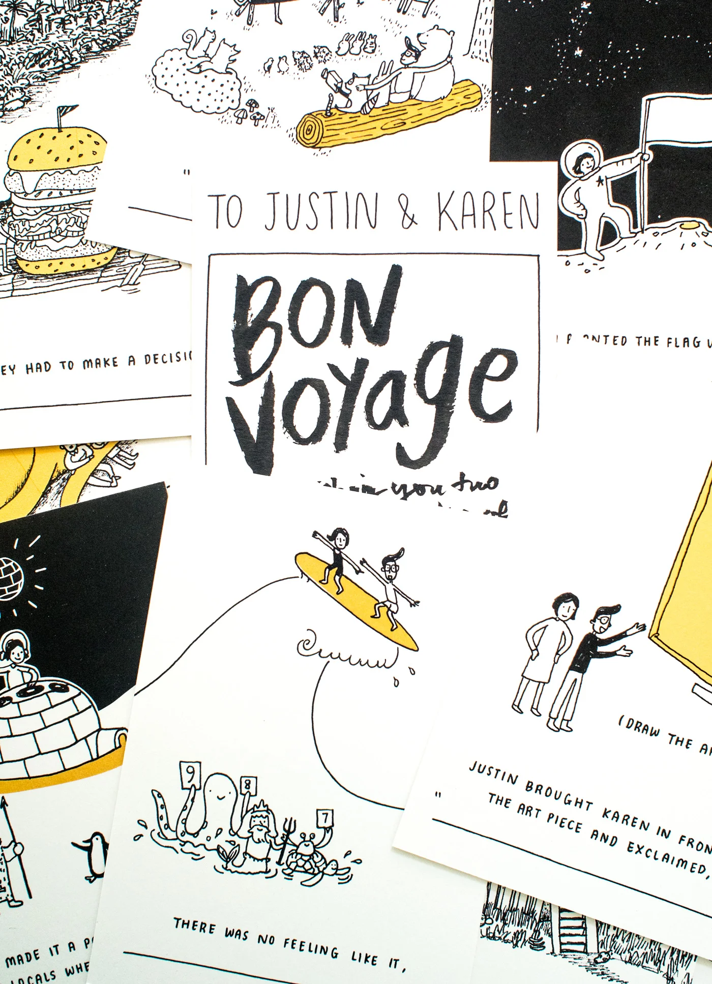 Instead of a typical hard-bound guestbook, we made a series of illustrated postcards of Justin & Karen on a big adventure somewhere, where guests could fill in and describe the scene happening in the postcard. Being the intrepid travelers that they were, you could find them in the Burger Ruins of the Amazon Forest, to finding treasure amidst treacherous deep seas, to disco dancing and dj-ing in the North Pole with the locals.